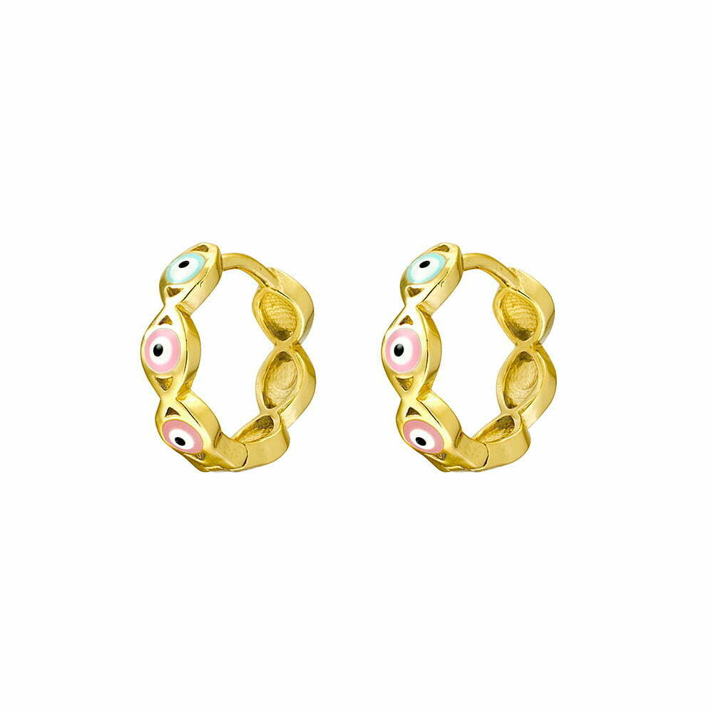 Gold Plated Sterling Silver mini huggie earrings featuring multiple evil eye in enamel.